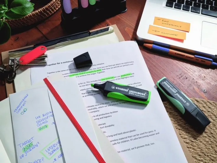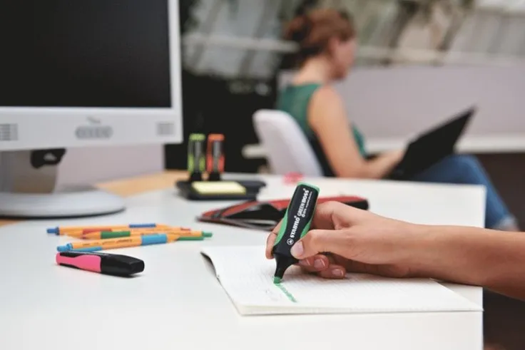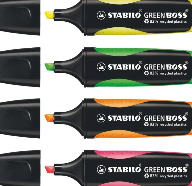 Hållbar överstrykningspenna!Denna STABILO överstrykningspenna kombinerar hög kvalitet med hållbarhet och är det perfekta valet för miljömedvetna konsumenter. Tillverkad av 83% återvunnen plast för att hjälpa till att bevara naturresurserna. Idealisk för långa arbetspass med många överstrykningar. Dess Anti-Dry-Out-teknik hindrar den från att torka ut i upp till 4 timmar utan kork. Tack vare sin supermångsidiga sneda spets kan STABILO GREEN BOSS rita linjer med olika tjocklek (2 mm eller 5 mm) – från breda markeringar för textblock till tunna linjer för anteckningar, understrykning och linjer. Långvarig användning ca 375 m. Vattenbaserat bläck. Det finns fyra neonfärger – gul, orange, grön och rosa. Förresten: visste du att STABILO har ett gemensamt återvinningsprojekt med Coca Cola? ”Procyclen” -plast, som är tillverkad av återvunna Coca Cola-skruvlock, används för att producera STABILO GREEN BOSS. Denna process sparar upp till 50 procent utsläpp av växthusgaser.