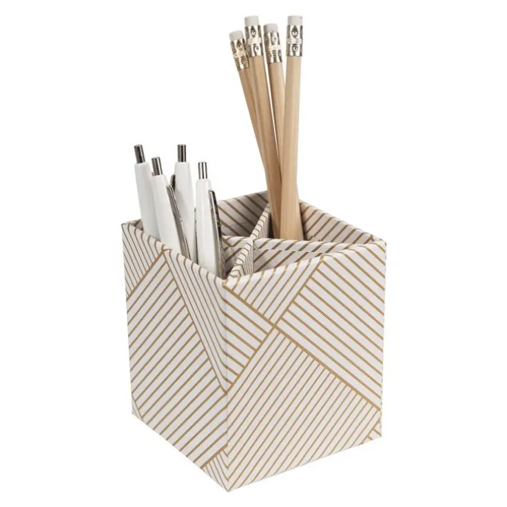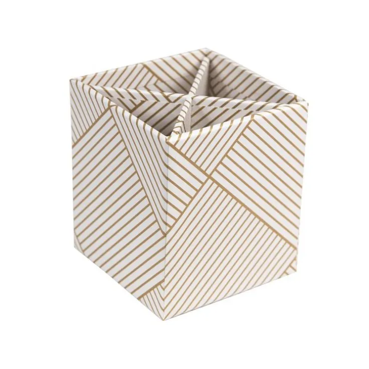 Pennburken Penny från Bigso Box of Sweden. Utformad med fyra fack för enkel sortering av dina pennor och övrigt på skrivbordet.Tillverkad i återvunnen fiberboard med ytskikt i lyxigt papperslaminat i vit och guld mönster. Finns i flera färger och material. Mått: 8,5×8,5x10cm
