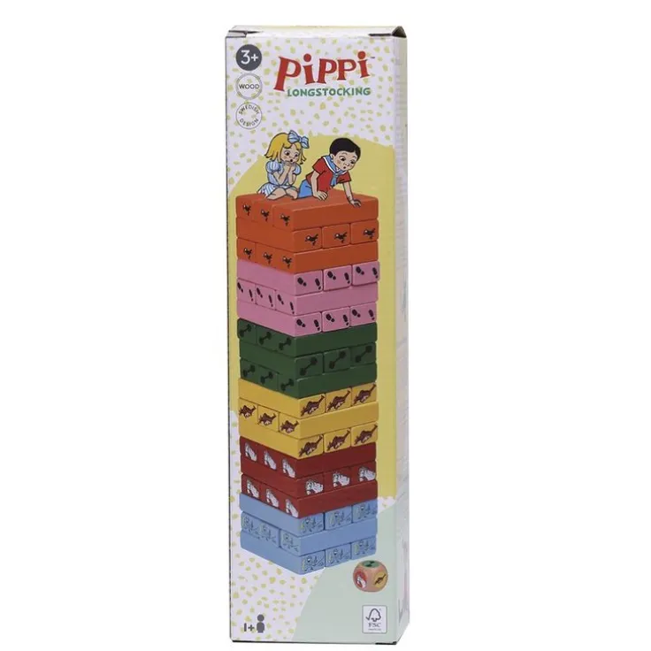 Roligt och nervkittlande spel för barn från Pippi! Bygg tornet, turas om att plocka klossar – och se vem som får det att rasa. Spelet kan spelas med eller utan tärning, vilket gör det lika kul för nybörjare som för lite större barn. Med 55 delar i tåligt material bjuder spelet på massor av skratt, koncentration och spänning. Ett klassiskt plockspel i färgglad Pippi-tappning som passar perfekt för barn från 3 år och uppåt. Tärning ingår