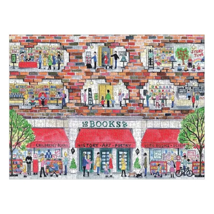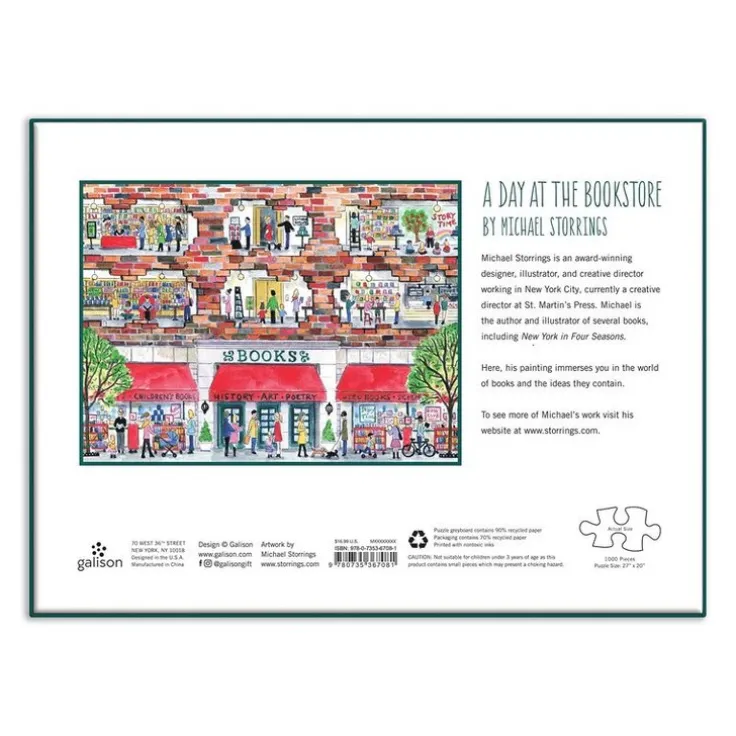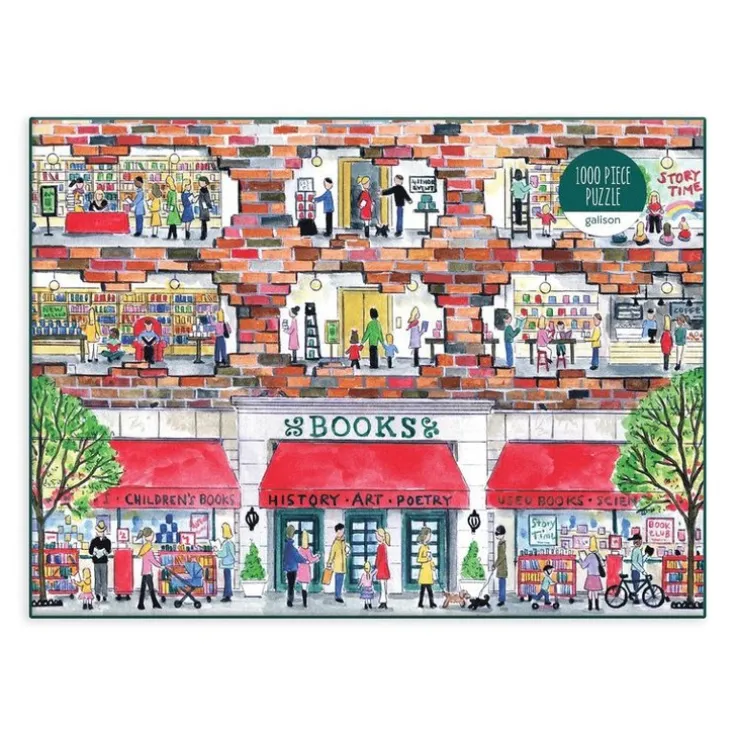 Pussel med 1000-bitar i en stadig och dekorativ ask. Pusselbitarna är i kraftig kartong och med en len yta, fina att hålla i. Asken innehåller en exakt bild av det färdiga pusslet, som är bra att ha tillhands som referens. Det färdiga pusslet är 686 x 508 mm stort. Den prisbelönta designern och illustratören Michael Storrings fångar charmen en dag i en bokhandel. De olika avdelningarna inne i bokhandeln samt livet på gatan utanför, blir till tydliga färgfält som gör pusslandet både intressant och roligt att lägga.