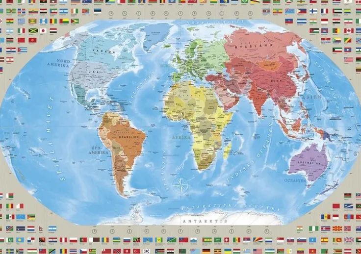 Världen Pussel 1000 bitar är ett roligt sätt att umgås med familjen och samtidigt lära mer om världens geografi. Pusslet har en politisk kartbild där kontinenterna presenteras i olika färger och angränsande länder visas i skiftande nyanser. Hav, länder och ett urval städer är markerade och runt om kartan finns respektive lands flagga. Pusslets storlek 68x48cm, lådan är 33x23x3,7cm, poster med pusselmotiv medföljer, svensk text.
