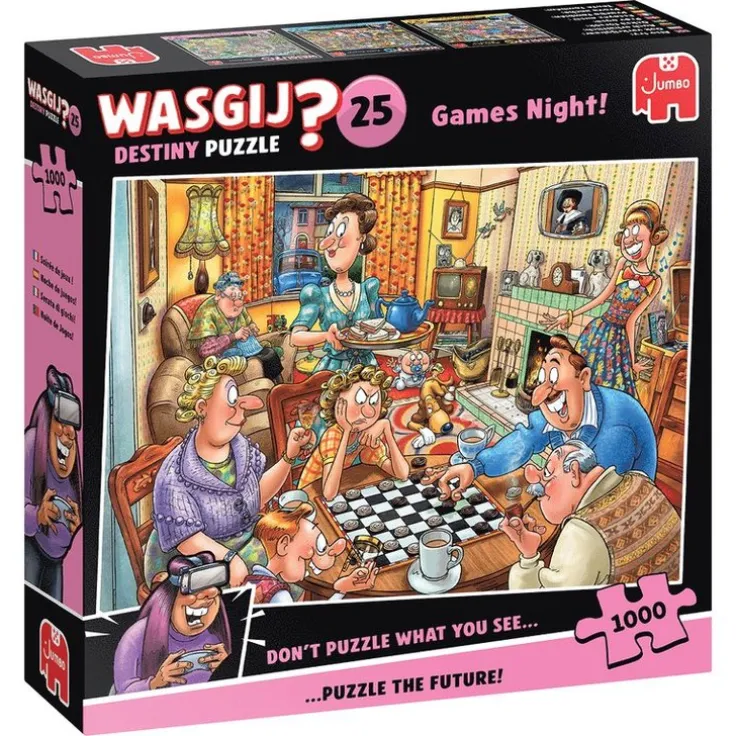 Introducing Wasgij Destiny 25 Games Night. Dive into the world of Wasgij Destiny 25 and experience a brainteaser like no other. Unlike traditional jigsaw puzzles, you won’t be piecing together the image on the box. Instead, you’ll challenge your imagination by puzzling the future. This innovative concept adds a fresh twist to your puzzle collection.Imagine how games night with the family has evolved over the years. With new technology, today’s games night might look significantly different from what we remember. Wasgij Destiny 25 captures this transformation, making it a fun and engaging puzzle experience.Wasgij puzzles are known for testing your imagination and problem-solving skills. This 1000-piece puzzle will push you to think outside the box, providing a rewarding challenge for puzzle enthusiasts who crave something beyond the ordinary.Crafted from 100% recycled cardboard, this jigsaw puzzle promises sustainability without compromising on quality. Each piece is precision die-cut to ensure it maintains its original shape, guaranteeing a satisfying and seamless puzzling experience.Embrace the challenge of Wasgij. With no picture to guide you, use your imagination and the clues provided to uncover the future scene. Perfect for seasoned puzzlers and those looking to elevate their puzzle game, Wasgij Destiny 25 offers hours of brainteasing fun.