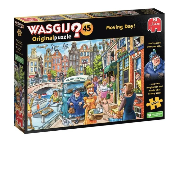 Dive into the lively and unpredictable world of moving day with the Wasgij Original 45: Moving House 1000-piece puzzle. This engaging puzzle turns an everyday scenario into an extraordinary adventure, filled with humor, hidden surprises, and a touch of the unexpected. Tasked with imagining the scene from an alternative perspective, puzzlers will revel in the challenge of piecing together the reactions and outcomes of this bustling day.From the moment the puzzle box is opened, you’re transported to a street alive with the commotion of moving. Neighbours, pets, and movers contribute to the lively atmosphere, each adding their unique twist to the day’s events. The detailed artwork invites you to search for clues and piece together the story unfolding before your eyes, promising hours of entertainment and satisfaction upon completion.