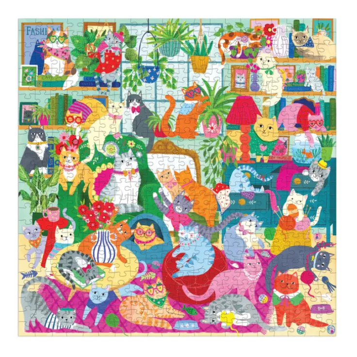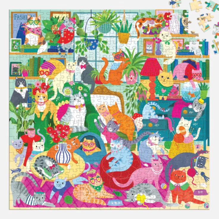 Ett 500-bitars pussel med en livlig vardagsrumsscen fylld med katter och massor av udda detaljer att upptäcka! Detta 500-bitars pussel har precis rätt nivå av utmaning för hela familjen att delta i och njuta av timmar av pusselnöje! Pusslet är förpackat i en stadig ask och en affisch med pusselmotivet i sin helhet ligger med. Fina släta pusselbitar utan pusseldamm. Det färdiga pusslets storlek är 508 x 365 mm.
