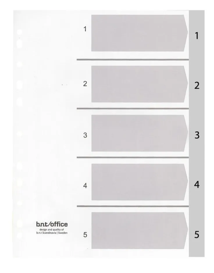Plastregister 1-5, flikar med indexsida i papper. 11 håls multihålning för 2,3,4 och Svenskt hålavstånd.
