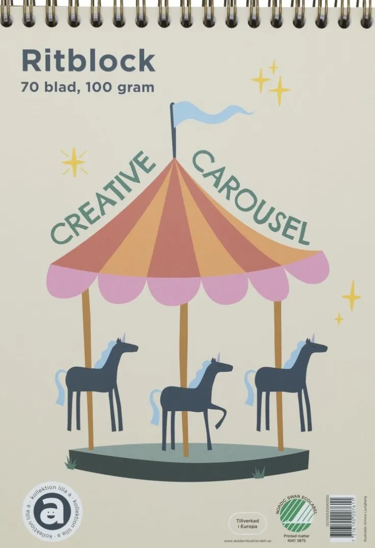 Spiralbundet ritblock i A5-format med motiv av en färggrann karusell. Med dess 70 blanka och tjocka blad är detta det perfekta blocket att fylla med kreativa mästerverk. Passar till kritor, vattenfärger, tusch- och färgpennor. Svanenmärkt. Tillverkad i Europa. 70 blad. Unik design, illustration av Emma Ljungberg. Ingår i Akademibokhandelns egen kollektion – Kollektion lilla a.