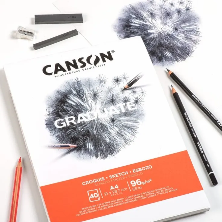 Canson® Graduate Sketch-block i A4 format innehåller lite tjockare vitt papper. Blocket består av 40 ark med lätt strukturerat papper som är perfekt för att sudda ut detaljer och för snabba blyertsskisser. Syrafritt och FSC-certifierat papper tillverkat i Frankrike.