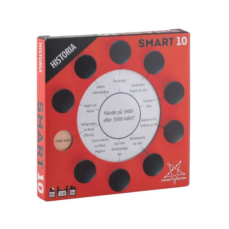 En uppsättning nya frågekort till SMART10: 50 dubbelsidiga kort med 100 nya frågor och 1000 nya svar! Förpackningen har västvärldens historia som tema, med frågor som handlar om statschefer och andra historiska personer, händelser och tidpunkter, krigshistoria, kolonier, upptäcktsresor och internationella organisationer. Byt ut frågekorten i Smartboxen mot två förpackningar temafrågor eller blanda temaförpackningen Historia med hälften av de ursprungliga frågorna. För att kunna använda dessa frågekort behövs även Smartboxen ur SMART10 eller SMART10 JR. 2-8 spelare, 20 min+, 14+