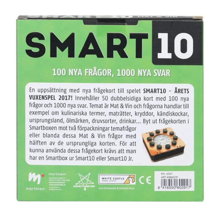En uppsättning nya frågekort till spelet Smart10 – Årets Vuxenspel 2017! Innehåller 50 dubbelsidiga kort med 100 nya frågor och 1000 nya svar. Temat är Mat & Vin och frågorna handlar till exempel om kulinariska termer, maträtter, kryddor, kändiskockar, ursprungsland, ölmärken, druvsorter, drinkar… Byt ut frågekorten i Smartboxen mot två förpackningar temafrågor eller blanda dessa Mat & Vin frågor med hälften av de ursprungliga korten. För att kunna använda dessa frågekort krävs att man har en Smartbox ur Smart10 eller Smart10 Jr. Regler på svenska. 2-8 spelare, 20 min+, 14+