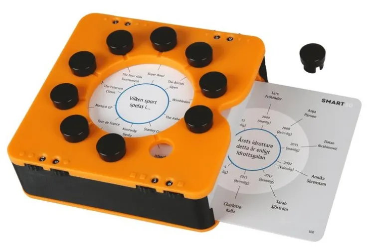 Årets vuxenspel 2017! Smart10 är ett kompakt spel med 200 frågor av olika slag och 2000 svar. Högt och lågt – rangordning, antal, rätt/fel, siffror och färger mm. Allt som behövs ryms i den lilla spelenheten – frågor, svarsmarkörer och poängräknare. Alla spelare får chansen att svara på alla frågor – men hur många svar kan du? Vågar du svara eller är det bättre att passa? ”Går med fördel att spela i lag, vilket ger utrymme för vilda och intressanta diskussioner mellan lagmedlemmarna”, var Årets spel-juryns omdöme. Regler på svenska. 2-8 spelare, 20 min, 14+
