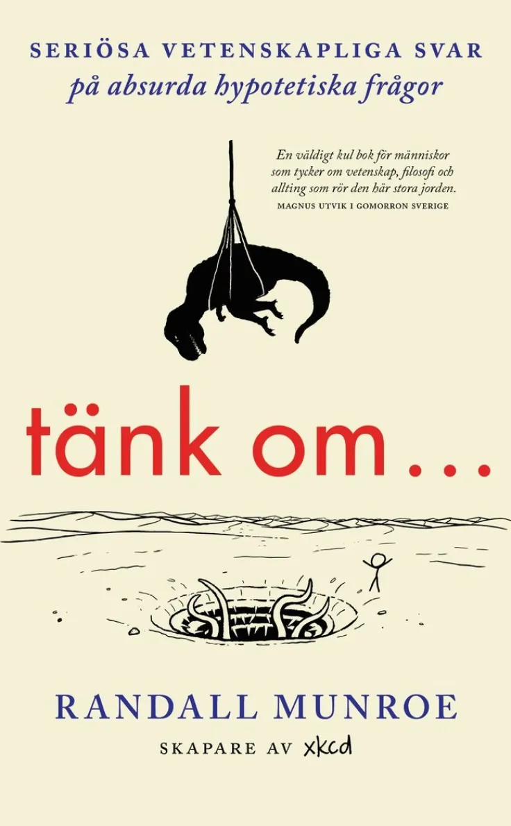 INTERNATIONELL BÄSTSÄLJARE UTGIVEN PÅ 30+ SPRÅK Miljontals människor besöker varje vecka xkcd.com för att ta del av Randall Munroes nätserie. Munroes streckgubbar som funderar på vetenskap, teknologi, språk och kärlek (bland mycket annat) har blivit omåttligt populära, och lika uppskattade är hans svar på läsarnas mest absurda frågor. Från vilken höjd behöver man släppa en köttbit för att den ska vara färdiggrillad när den når marken? Kan man använda uppochnervända kulsprutor som en jetpack? Går det att bygga en bro av Lego över Atlanten? I jakten på svar använder Munroe avancerade datorsimuleringar, gräver djupt i militära arkiv, pratar med kärnkraftstekniker, analyserar Star Wars-filmerna med ett stoppur, ringer sin mamma och bildgooglar djur. Munroes svar är precisa och underhållande när han förklarar allt ifrån möjligheten att hitta en eventuell själsfrände, till de många hemska sätt du kan dö på om du blandar alla grundämnen. En väldigt kul bok för människor som tycker om vetenskap, filosofi och allting som rör den här stora jorden. Magnus Utvik i Gomorron Sverige ”Underbar! Randall Munroe måste vara världens näst roligaste vetenskapskomiker.” Jesper Rönndahl, vetenskapskomiker och programledare för Institutet i P3 Randall Munroe var tidigare anställd vid amerikanska NASA. Han fick nyligen en asteroid uppkallad efter sig Munroe 4942 som är stor nog att orsaka en massiv katastrof om den skulle krocka med jorden. Tänk om har blivit en global succé och ges ut i fler än 30 länder.