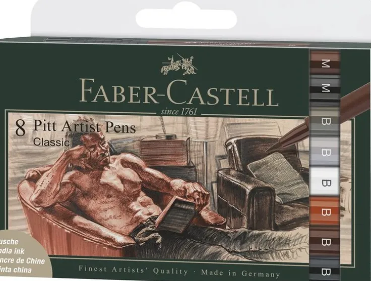 Pitt Artist Pen Brush India ink pen, ask med 8 penselpennor, Classic. Set med klassiska färger som utgör en klockren färgbas. Fantastiska penselpennor med högpigmenterat India ink. Ljusäkta. Lång och metallomsluten spets. Vattentåligt och permanent bläck. Lukftfritt, syrafritt och pH-neutralt. Blöder inte igenom papper. Pitt Artist serien är en global storfavorit bland både proffesionella och amatörkonstnärer tack vare dess höga kvalitet och följsamma och tåliga spetsar. Pitt Artist pennorna är perfekta för bl.a. sketcher, teckningar, layout, mode-design och illustrationer.