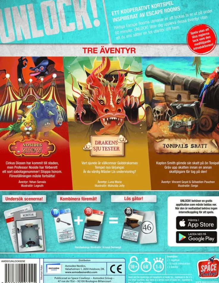 Unlock! är ett samarbetes spel som är inspirerat av de populära Escape Room och använder sig av enkla men smarta system som låter dig utforska olika platser, kombinera objekt och lösa de olika gåtorna som ställs framför dig. Unlock! Fantastiska Äventyr tar med dig på tre nya diverse äventyr runt olika platser i ditt egna vardagsrum genom användandet av kort och en medföljande kompanjon app som kan ge en ledtrådar, lösa koder och håller kolla på kvarstående tid. Unlock! kräver nedladdandet av den medföljande gratis appen från App Store eller Google Play, väl nedladdat krävs ingen internetanslutning.