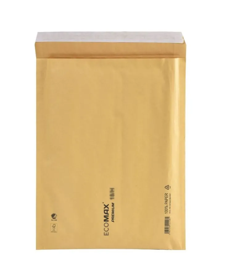 Ecomax Premium® är helt plastfria vadderade kuvert för frakt och förvaring av känsliga föremål. De är väldigt lätta, vilket innebär lägre fraktkostnader. Kuverten är gjorda av 6 lager starkt och vattenavvisande obestruket papper. Insidan är fodrad med ett dubbelt skyddande lager av 100g bubbelpapper, vilket gör kuvertet styvt, dämpar stötar och minimerar revor, veck samt hindrar att kuvertet slits sönder. Kan bl a användas för elektroniska komponenter, mobiltelefoner, smycken, presenter, dokument, böcker mm.Klaffen appliceras med ett starkt smältlim som säkerställer en hållbar stängning. Kanterna är breda och tillsammans med den fult fodrade botten hindrar detta att kuvertet går sönder. Kuverten består av 100% papper och är biologiskt nedbrytbara. De har ett flertal miljömärkningar – däribland Svanenmärket.Yttermått: 320 x 455mm Innermått: 300 x 445mm Vikt per kuvert: 78,45g