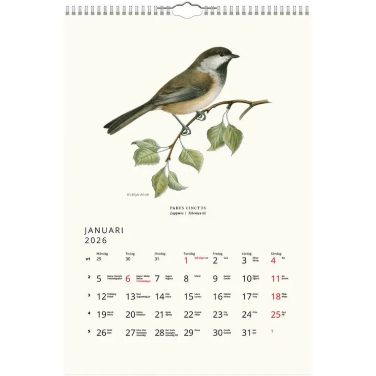 Väggkalender Fåglar 2026 med illustrationer av Magnus, Wilhelm och Ferdinand von Wright från 1800-talets mitt och slut. Svenska namndagar och helgdagar. Kalendern är producerad och tryckt i Sverige på svenskt papper. Märkt med både Svanen och FSC.
