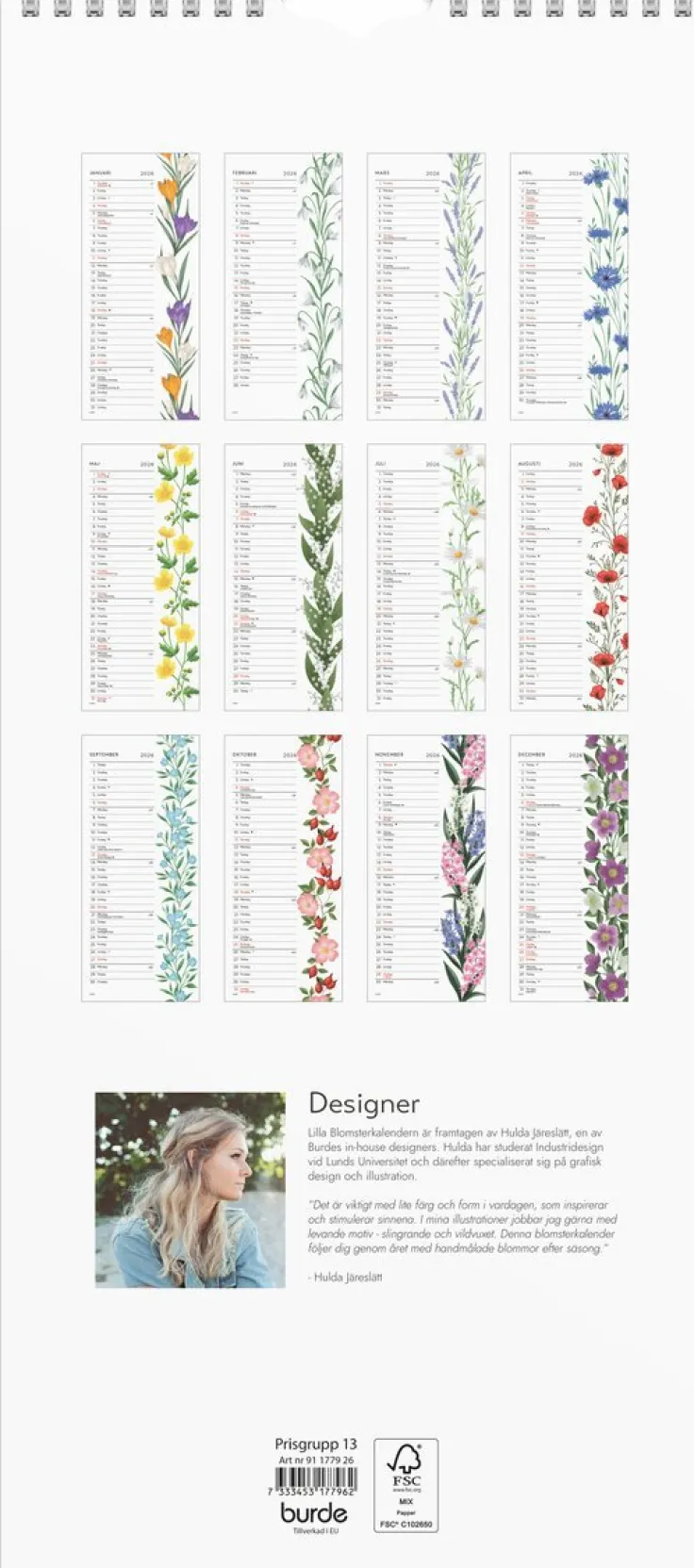 Väggkalender för hemmet men blomillustrationer. En månad per uppslag och en rad för varje dag/månad som gör att du snabbt och lätt kan överskåda dina övergripande planer för månaden.>Väggkalender 2026 från Burde. Format: 190×430 mm. Layout: Månad/blad. Kalendarium: 2026-01-01 – 2026-12-31. Spiralbunden. Innehåll: Flaggdagar, helgdagar/aftnar, månfaser, namnsdagsregister, temadagar/händelser,. Antal sidor: 12. Miljöinformation: FSC®.