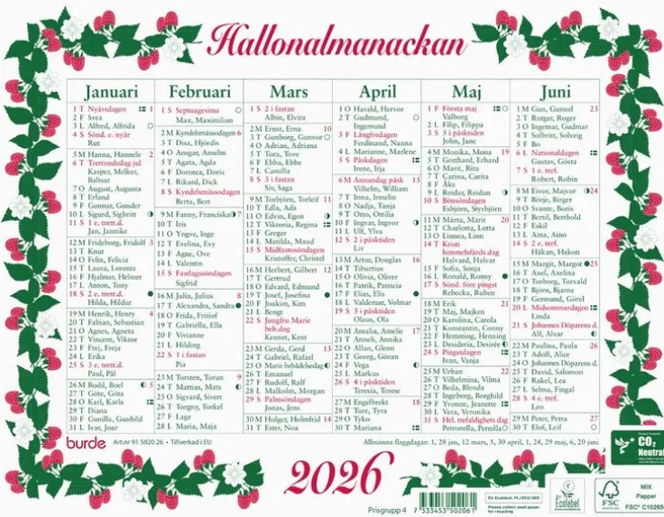 Väggkalender 2026 från Burde. Format: 245×190 mm. Layout: Halvår/sida. Kalendarium: 2026-01-01 – 2026-12-31. Innehåll: Kyrkliga helgdagar, flaggdagar, helgdagar, månfaser, namnsdagar,. Antal sidor: 2. Miljöinformation: FSC®. Klimatkompenserad. Ecolabel.